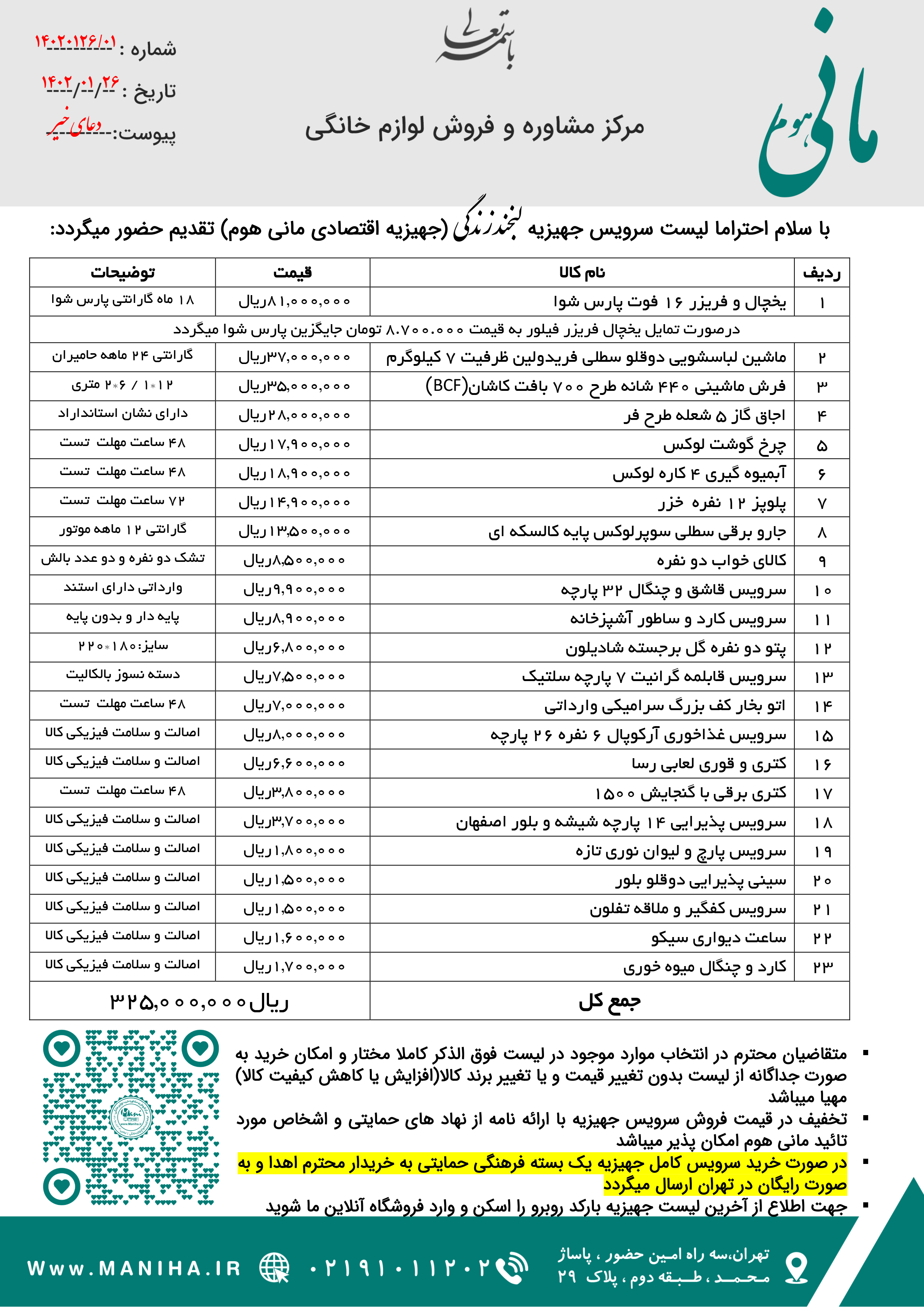 احتراما به استحضار خیرین گرانقدر و مشتریان عزیز میرساند با توجه به افزایش قیمت تمام شده ی اکثر کالا ها لیست قیمت جهیزیه لبخند زندگی منتشر و به شرح زیر به اطلاع میرسد: