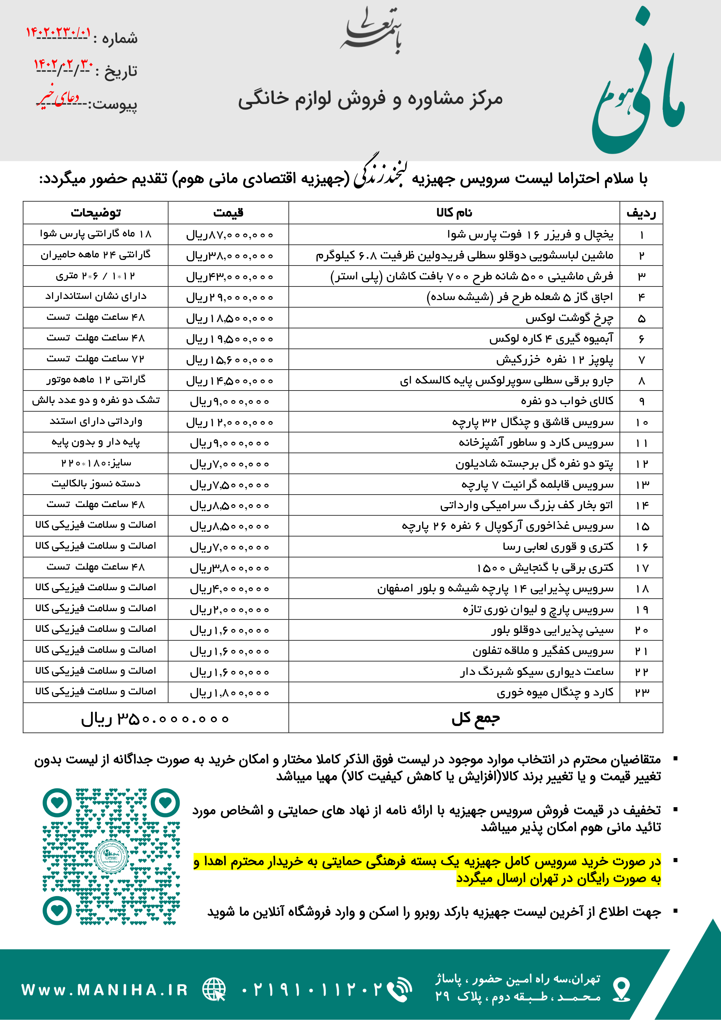 احتراما به استحضار خیرین گرانقدر و مشتریان عزیز میرساند با توجه به افزایش قیمت تمام شده ی برخی کالا ها لیست قیمت جهیزیه لبخند زندگی منتشر و به شرح زیر به اطلاع میرسد:
