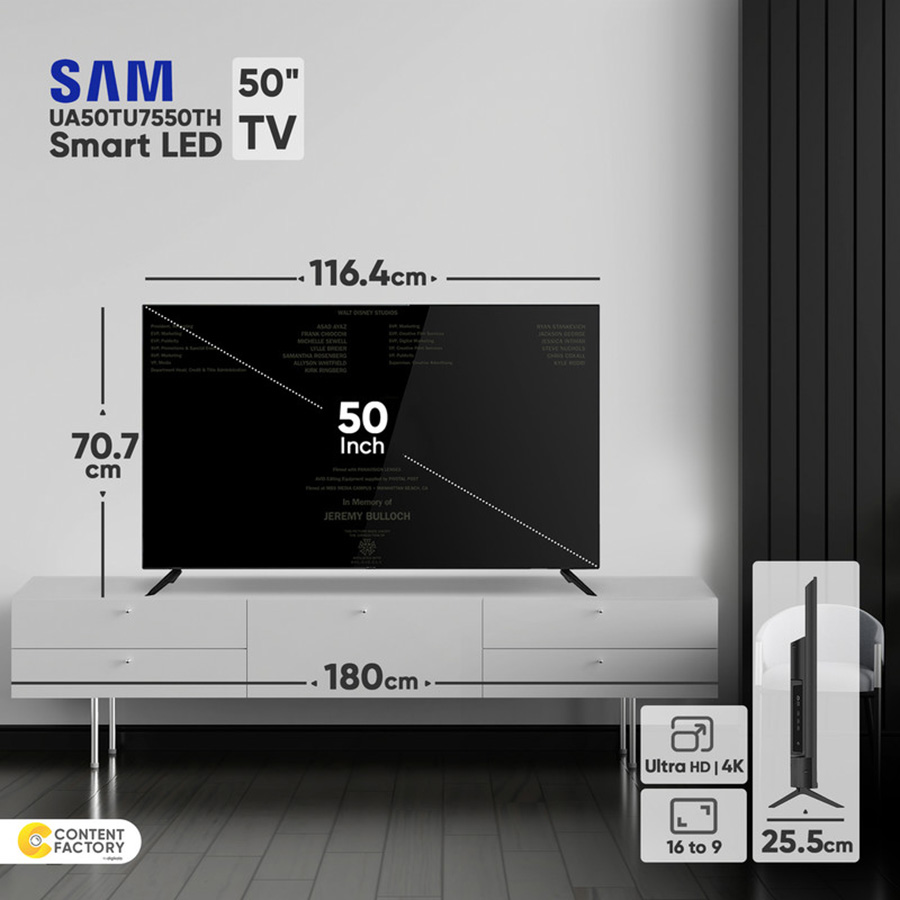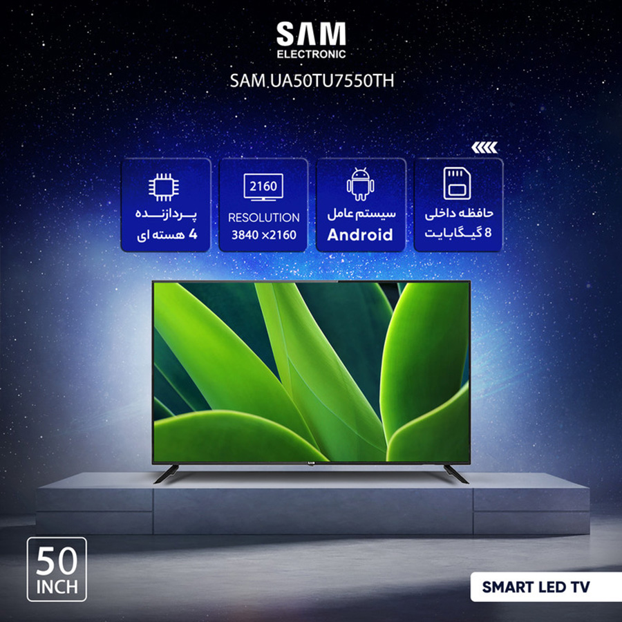 تلویزیون ال ای دی هوشمند سام مدل UA50TU7550TH سایز 50 اینچ از سیستم عامل اندروید استفاده میکند. این مدل با ابعاد 50 اینچی با یک طراحی زیبا روانه بازار شده است. شرکت سام این مدل را به یک صفحه نمایش با کیفیت ULTRA HD مجهز کرده که میتواند تصاویر باکیفیتی ارائه دهد. از دیگر ویژگی بارز صفحه نمایش این محصول میتوان به قابلیت HDR آن اشاره کرد که این قابلیت محدوده کنتراست و دقت رنگها را توسعه میدهد. وجود یک گیرندهی دیجیتال داخلی با تیونر DVB-T2، کاربر را از تهیهی یک دستگاه جداگانه بینیاز میکند. برای توضیح در رابطه با پورتهای ورودی و خروجی این تلویزیون، باید گفت که روی بدنهی آن، دو درگاه USB 2.0 تعبیه شده است که از این طریق میتوانید فلشمموری و هارداکسترنال خود را به تلویزیون متصل کرده و از فایلهای موجود در آنها استفاده کنید. دو درگاه HDMI این تلویزیون، امکان اتصالش را به سایر پخشکنندههای صوتیوتصویری ممکن کرده است.