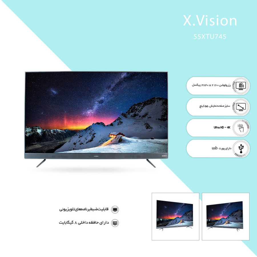 تلویزیون هوشمند ال ای دی ایکس ویژن مدل 55XTU745 با اندازه 55 اینچی خود، تلویزیونی مستحکم، بادوام و بسیار خوش ساخت از برند X-vision است. این تلویزیون از کمپانی ایکس ویژن امکانات متعدد و کاربردی را در اختیار خریدارانش میگذارد. کیفیت صفحه نمایشگر این تلویزیون 4K میباشد، در نتیجه تصاویر در این دستگاه با وضوح و شفافیت بسیار بالایی نمایش داده میشوند. کاربران این تلویزیون ایکس ویژن، به لطف زاویه دید وسیعی که دارد، امکان تماشای صفحه نمایش را از محدوده وسیعی دارند. این تلویزیون X-vision مجهز به دو درگاه USB است، که کاربر را قادر میسازد با اتصال فلشمموری و هارد اکسترنال به تلویزیون از فایلهای موجود در آنها استفاده کند. درگاه HDMI نیز این امکان را به خریداران میدهد که تصاویر را با کیفیت 4K به صفحهنمایش منتقل نمایند. از دیگر امکانات تلویزیون مدل 55XTU745 از شرکت ایکس ویژن، قابلیت ماشین زمان (Time Shift) است؛ این قابلیت این امکان را به خریداران میدهد که برنامه مورد علاقه در حال پخش را ضبط نمایند، و بتوانند به لحظات قبلی بازگردند.