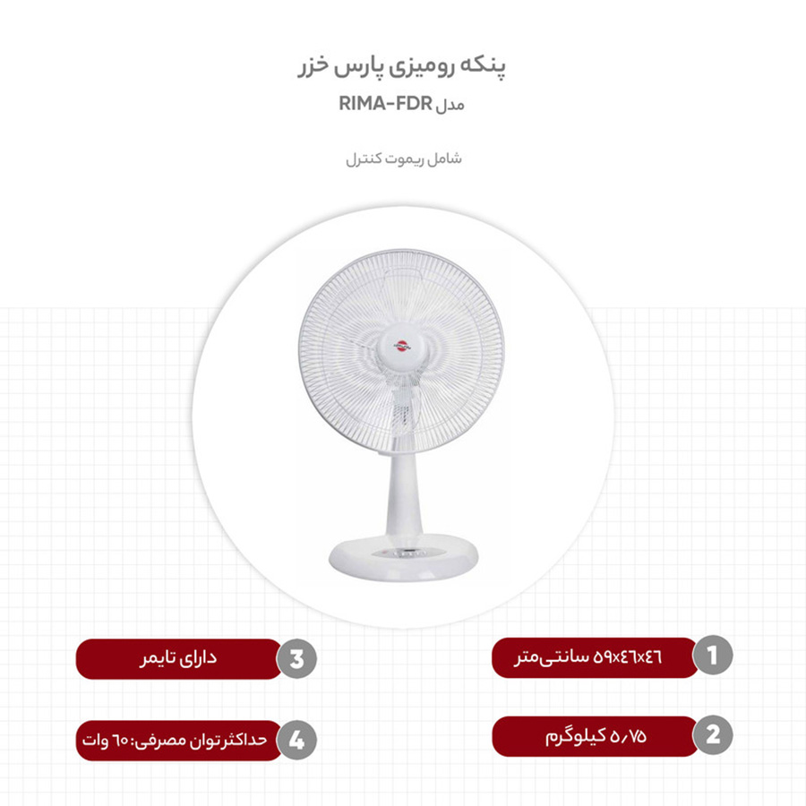 پنکه رومیزی پارس خزر مدل RIMA-FDR گزینهای سه پره، کم صدا با ابعاد و حجم باددهی مناسب برای خانههایی به اندازهی زیر 80 متر است که از ریموت کنترل، تایمر و امکان تغییر سرعت در سه حالت پشتیبانی میکند. این مدل پنکهی رومیزی دستگیرهای به منظور حمل آسان کالا دارد و با و وجود بدنهای ساخته شده از پلاستیک نشکن در زمان کار حتی بر روی دور تند هیچگونه لرزشی را ایجاد نمیکند. قابلیت تنظیم زاویهی عمودی وزش باد و پشتیبانی از حالت ریتم از دیگر مشخصههای این دستگاه خانگی است که با قیمت معقولی به بازار عرضه شده است.