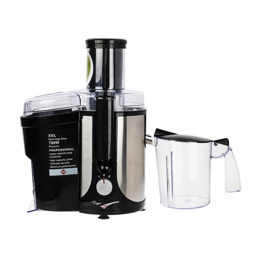 این آبمیوهگیری 700 وات قدرت دارد. موتور این دستگاه دوسرعته و آنقدر قدرتمند است که میتواند میوههای سفت را هم آبگیری کند. با پیچ تنظیم سرعت موتور میتوان سرعت پایین را برای آبگرفتن میوههای نرم و سرعت بالای دستگاه را برای آبگیری میوههای سخت در نظر گرفت. این آبمیوهگیری دو عدد میکرو سوئیچ ایمنی دارد. بسکت و تیغهی آبمیوهگیری از جنس استیل ضدزنگ بوده و کیفیت ساخت آنها خوب است. قطر دهانهی ورودی این مدل آبمیوهگیری 75 میلیمتر است؛ یعنی بهقدر کافی بزرگ هست که بتوان میوههای درشتتر مثل سیب را بهصورت کامل و بدون نیاز به برش در آن انداخت. بهاینترتیب نیازی به ریزکردن میوهها نیست. تفالهی میوه به مخزن تفاله منتقل میشود و آبمیوه از سمت دیگر خارج میشود. آبمیوهگیری پارس خزر مدل تایگر یک پارچ جمعآوری آبمیوه هم دارد تا آبمیوه بدون اینکه به زمین یا روی میز بریزد، به این پارچ منتقل شود. این پارچ طوری طراحی شده است که به خروجی دستگاه متصل میشود. بعد از اینکه آب میوهها را گرفتید، میتوانید پارچ مدرج مخصوص را در یخچال بگذارید تا آبمیوه خنک شود. ظرفیت این پارچ یک لیتر است.